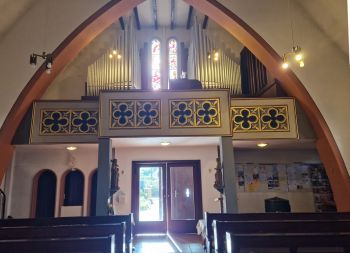 Hier ein Blick zur Orgel. Die Empore erhielt 1986 eine neue Brüstung im gotischen Stil.