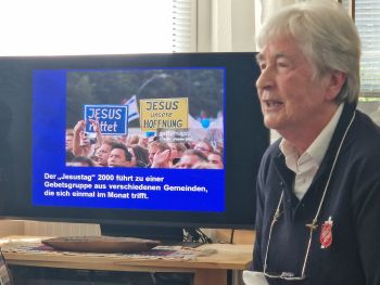 Mit einer Power-Point-Präsentation "Wunder werden wahr" erzählte uns Rolf Metzger von den Wundern in seinem Leben, zu denen gehört, wie er zur Heilsarmee gekommen ist und was er dort erlebte. Das erste Wunder aber ist für ihn, dass er als kleines Kind nicht durch die Bombardierung Essens umgekommen ist, sondern dank einer Erkrankung rechtzeitig evakuiert wurde.