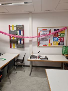 Der Raum ist nicht allzu groß, hat keine Klassenraumgröße, aber lädt seinen bunt gestalteten Wänden und Aushängen ein, zu gucken, was es hier gibt.
