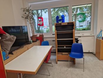 Durch den hinteren Eingang kommt man in der 1. Etage direkt zu dem Raum, in dem Mitarbeiter der "Arche" Angebote für die Kinder bereithalten: montags bis donnerstags von 8:30 - 16:30 und freitags von 9:00-17:00 Uhr. Keins der Kinder ist hier angemeldet, wie es im Hort der Fall ist. Sie kommen aus Eigeninitiative. Ca. 80 sind es die Woche und die Mitarbeitenden kennen sie persönlich mit Namen.