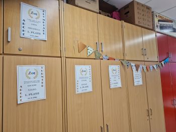 Die Kinder erfahren hier Anerkennung und erhalten u.a. Urkunden, wie hier am Schrank zu sehen ist. Sie erhalten Hilfe bei den Schularbeiten, wofür nachmittags auch die nebenliegenden Klassenräume von den Mitarbeitern genutzt werden können. Der Schulhof kann für Spiele und Bewegung genutzt werden. Außerdem organisiert das Team in Zusammenarbeit mit den Lehrern alle 14-Tage eine Fahrt mit einem Bus zu dem Arche-Bauernhof in Paaren.
