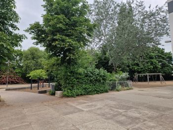 Auch auf der anderen Seite des Schulgeländes gibt es eine große Fläche zum Klettern und sich bewegen, die nachmittags auch von den Hortkindern rege genutzt werden.