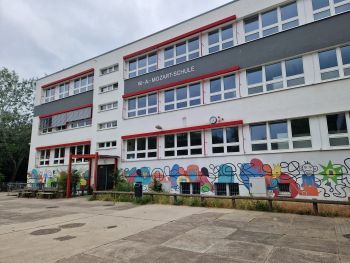 Die Mozart-Schule liegt mitten in einem ruhigen Hellersdorfer Wohngebiet. Wir Marzahner, an der Bushaltestelle Spremberger Straße angekommen, mussten erst mal etwas suchen und fragen, ehe wir sie fanden.