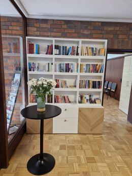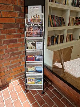 Links im Eingangsbereich befindet sich ein Schrank mit Büchern: die Bibliothek mit christlicher Literatur.