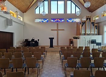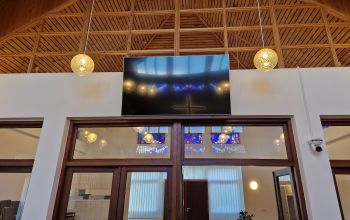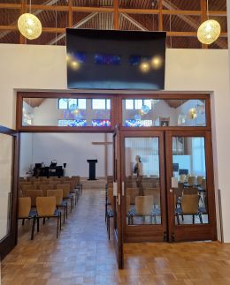 Für den Prediger am Pult und den Chor ist ein Bildschirm über der Eingangstür angebracht. Hier können Bibeltexte, Aufzeichnungen sowie Lieder ausgestrahlt werden.