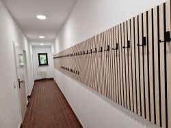 Dann führt ein Flur zu den Toiletten (links) und ganz hinten zu einem weiteren Raum für die Kinder mittleren Alters. Die Garderobe zeigt: Hier werden viele Gemeindeglieder erwartet, Kleine und Große. Auch hier wurde an die Kinder gedacht!