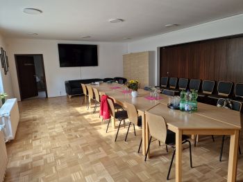 Von hier kommt man in den Raum für die Jugend und Konfirmanden. An der Stirnseite ist ein großer Bildschirm an der Wand, wie in allen Räumen hier.