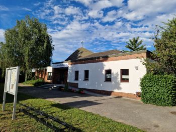 Auf unserer 12. Station waren wir schon einmal hier. Da stand über dem Eingang noch "Ev. Versöhnungskirchengemeinde". Der Biesdorfer Gemeinde gehört das Haus und Grundstück immer noch, aber im Februar feierte sie hier ihren letzten Gottesdienst und vermietet seitdem ihr Gemeindezentrum-Nord an die Evangelisch-lutherische Gemeinde Haus Gottes. Denn nach der Fertigstellung des Neubaus eines Gemeindezentrums an der B1 sollen alle Gottesdienste und Veranstaltungen dann dort und in der Kirche stattfinden. Noch ist da allerdings eine Baustelle, zu deren Besichtigung jetzt am Sonntag nach dem Gottesdienst auf der Webseite der Gemeinde eingeladen wird.
