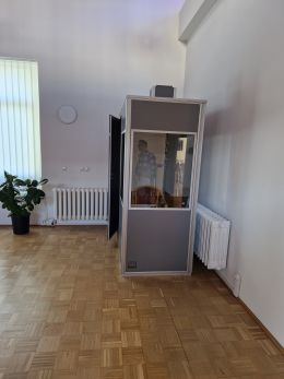 Auf der rechten Seite steht eine schalldichte Übersetzungskabine. Bis vor 3 Jahren waren die Gottesdienste zweisprachig, deutsch und russisch. Dann hat sich die Gemeinde entschieden, sie ganz auf Deutsch zu feiern. Für jene, die es nicht verstehen, wird von hier aus übersetzt.