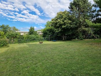 Zum Schluss gehen wir nach draußen. Auf der großen Wiese gibt es schon ein Klettergerüst und eine Schaukel für die Kinder, dazu ein Fußballtor. Ein Zaun wurde gezogen, um das Gelände abzugrenzen von dem Wohnhaus dahinter/daneben, das weiterhin von der Biesdorfer Gemeinde genutzt wird.
