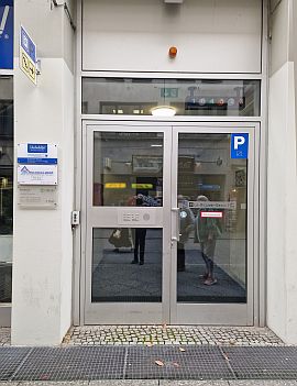 Beim Gang zum Ausgang in die Lil-Dagover-Gasse kommen wir am dritten Eingang zum Fahrstuhl vorbei. "Viele Wege führen nach Rom" bzw. hier zum Fahrstuhl in die 4. Etage und zu den dort Arbeitenden!