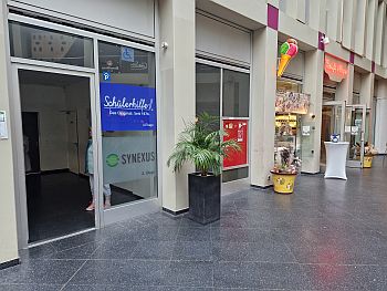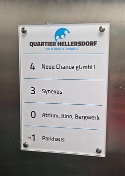 Hier das Hinweisschild im Fahrstuhl. In der vierten Etage befindet sich links das Büro der Neuen Chance gGmbH und auf der rechten Seite ist der Eingang der Schülerhilfe.