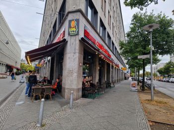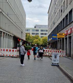 Links und rechts gibt es viele Geschäfte. Der Eingang zur 2 liegt auf der linken Seite hinter dem Eiscafé mit seinem Außen-Sitzbereich.