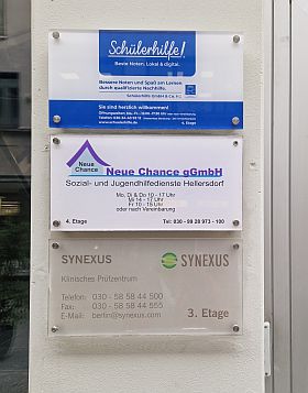 Seit 14 Jahren ist die "Neue Chance gGmbH" hier in unserem Stadtbezirk zu finden, arbeitet aber Berlin weit. Sie ist Mitglied im Diakonischen Werk. Mitarbeiten kann aber jeder, also auch ohne Mitgliedschaft in einer Kirche. Als man aber kurz nach Gründung des Trägers danach fragte, stellte sich heraus, dass es etwa 25 Prozent der Mitarbeitenden aber waren.