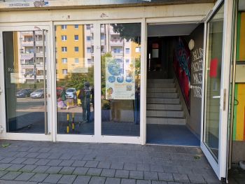 Auf unserer 66. Station waren wir schon einmal hier, als wir das Schüler-Zentrum "Kraftwerk" besuchten. Die Tür steht weit offen. Doch heute ist keine Ausgabe der Lebensmittel, es wird "nur" die morgige von den ehrenamtlichen Helfern vorbereitet. Auch am Freitag werden hier wieder Hunderte stehen und auf die Tüten warten, die dann immer von der Tafel-Zentrale Beusselstraße zusätzlich bereitgestellt werden.