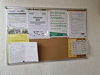 Daneben hängt ein Bord mit Info-Schriften zum Mitnehmen, auf dem ein Foto des Teams mit Jörg Pilawa steht, der seit 2019 Botschafter der "Tafeln" ist und sie hier 2024 besuchte, worüber man sich natürlich gefreut hat.