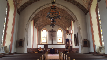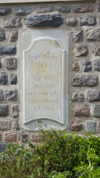 Daneben an der Wand erinnert ein Sandsteinrelief an die Einweihung der Kirche 1910 zusammen mit einem Wort aus dem Hebräerbrief (13,8): „Jesus Christus gestern, heute und derselbe auch in Ewigkeit“.