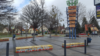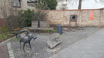 Mit der S-Bahn in Teltow angekommen empfing uns auf dem Bahnhofsvorplatz ein freundlicher Platz – S-Bahnen ganz klein als Sitzgelegenheit.