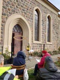 Beim Näherkommen staunten wir, wie viele Menschen sich vor der Kirche versammelt haben. Ja, der Gottesdienst, vorbereitet und gestaltet mit dem Team der Evangelischen Kindertagesstätte fand heute draußen statt. Das war mutig, denn wir haben ja April! Und tatsächlich war es typisches Aprilwetter, obwohl trockenes Wetter vorhergesagt war. Aber das nahm den Teilnehmenden, Großen und Kleinen nichts von der Freude, gemeinsam Gottesdienst zu feiern.