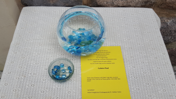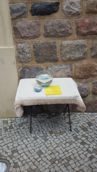 Neben der Kirchentür steht ein Tischchen, das zum Gebet einlädt in den Zeiten, in denen die Tür verschlossen ist. Die Steinchen im Wasser erzählen von der Anzahl der Gebetswünsche der Vorübergehenden und werden im Gottesdienst genannt und ins Gebet mit aufgenommen.