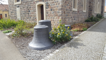Die alten eisernen Glocken stehen nun an der Rückseite der Kirche.