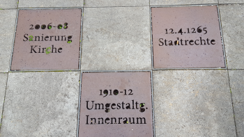 Auf dem Kirchplatz neben dem Haupteingang erzählen In Platten eingelassene Inschriften von der Stadt- und Kirchengeschichte Teltow. Hier Beispiele: